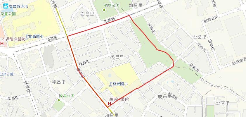 東至:後勁溪支流(七號帶狀公園)與宏榮里為界。 西至:後昌路與隆昌里為界。 南至:莒光國小圍牆後昌路780巷、及876巷2弄與慶昌里為界。 北至:加昌路與宏昌里為界。 面積 0‧一一二三平方公里。 |